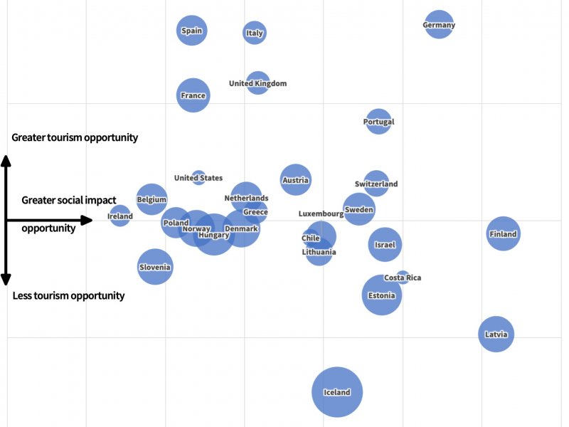 The chart and its methods are crude but interesting, perhaps at least because it attempts to show not just the level of need in a country but the potential capacity to meet that need and the resource for doing so – the opportunity. On this basis, for example, Iceland, which has the strongest cultural sector government spending percentage has perhaps more future opportunity unrealised in supporting social impact than tourism, and Finland, Latvia and Germany have particular potential opportunities for cultural sector social impact support. USA has approximately the same social impact opportunity as Spain, France and Norway, despite much smaller government cultural spend (bubble size) and indeed social protection and education spend, because it has higher GINI and secondary non-enrolment figures.